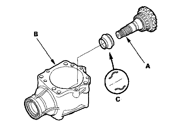 7. Remove the transfer output shaft (A) from the transfer housing (B), then remove the transfer spacer (C) from the transfer output shaft.