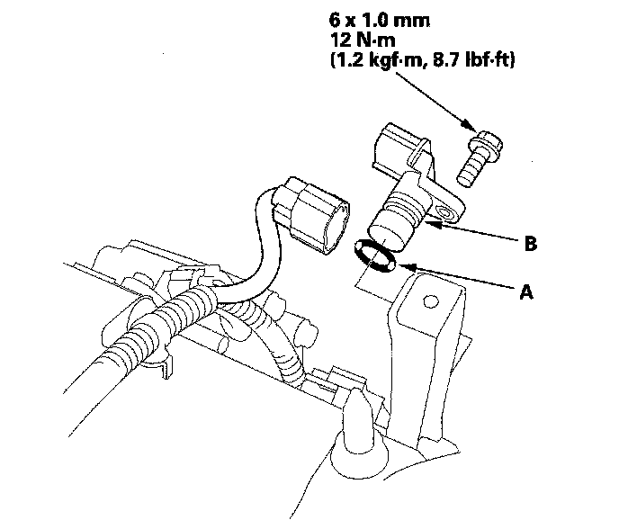 3. Install the new O-ring (A) on the new input shaft (mainshaft) speed sensor (B), then install the input shaft (mainshaft) speed sensor in the transmission housing.