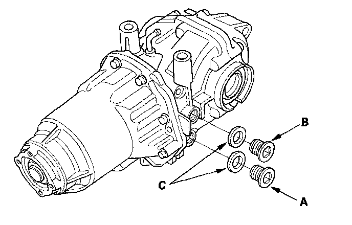 1. Remove the drain plug (A) and the oil filler plug (B) with sealing washers (C).