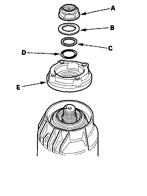7. Remove the locknut (A), the disc spring washer (B), the back-up ring (C), the O-ring (D), and the companion flange (E).