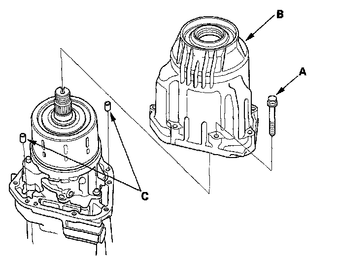 8. Remove the eight mounting bolts (A) in a crisscross pattern in several steps, then remove the torque control differential case (B) and the dowel pins (C).