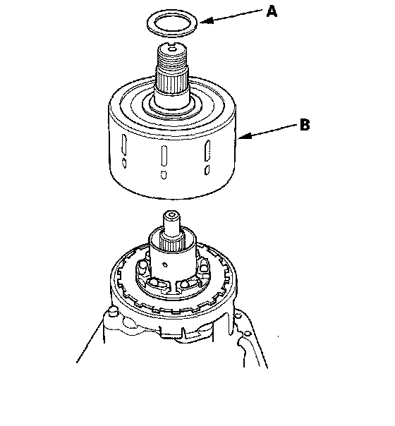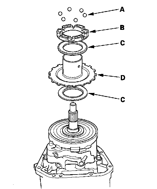 10. Remove the six steel balls (A), the base cam (B), the thrust needle bearings (C), and the pressure plate (D).