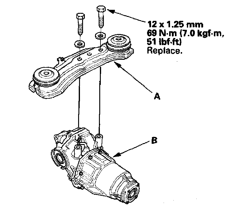 5. Install the plates (A) and torque the rear differential mount assembly mounting bolts (B).