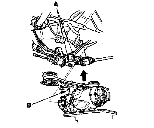 4. Lift the rear differential up into position, then push on both driveshafts to lock the set rings into place. Connect the breather tube (B).
