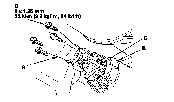 8. Install the No. 2 propeller shaft (A) onto the rear differential (B) by aligning the reference marks (C) made during removal. Make sure you use new mounting bolts (D).