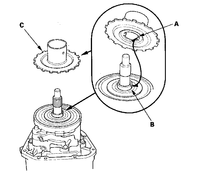 5. Align the tab (A) of the pressure plate with the groove (B) of the oil pump drive shaft, then install the pressure plate (C) on the oil pump assembly.