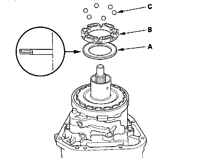 6. Install the thrust needle bearing (A), the base cam (B), and the six steel balls (C).