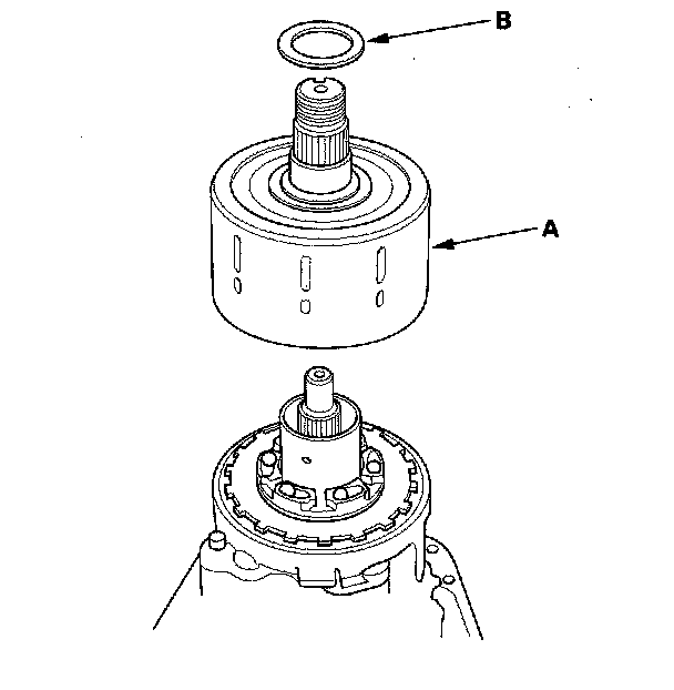 3. Install the oil pump driveshaft (A) by aligning the projection (B) of the oil pump driveshaft with the groove of the front oil pump in the oil pump body assembly.