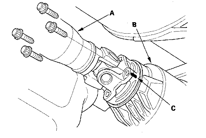 2. Mark the propeller shaft (A) and the companion flange of the rear differential assembly (B) so they can be reinstalled in their original positions (C).