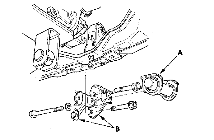 6. Place a transmission jack under the rear differential assembly, then remove the right and left rear differential mount bracket B.