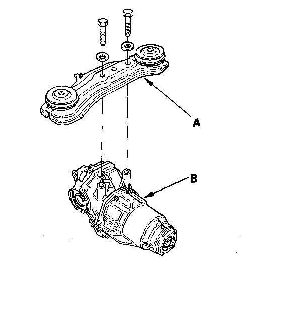 10. Remove the rear differential mount assembly (A) from the rear differential assembly (B).