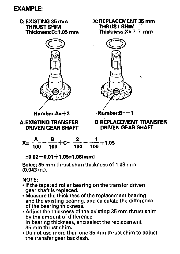 Use a thicker 35 mm thrust shim to move the transfer driven gear shaft toward the transfer drive gear. Because this movement causes the transfer gear backlash to change, move the transfer drive gear away from the transfer driven gear shaft to adjust the transfer gear backlash as follows: