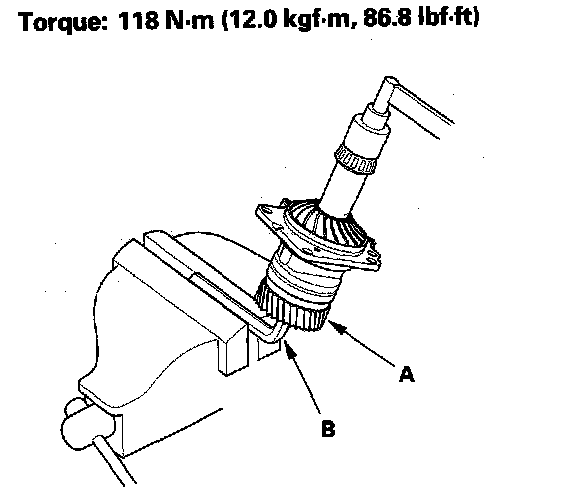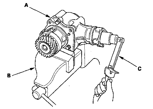 28. Secure the transfer housing (A) in a bench vise (B) with soft jaws, then rotate the companion flange several times to seat the tapered roller bearing.