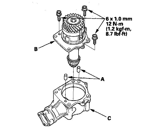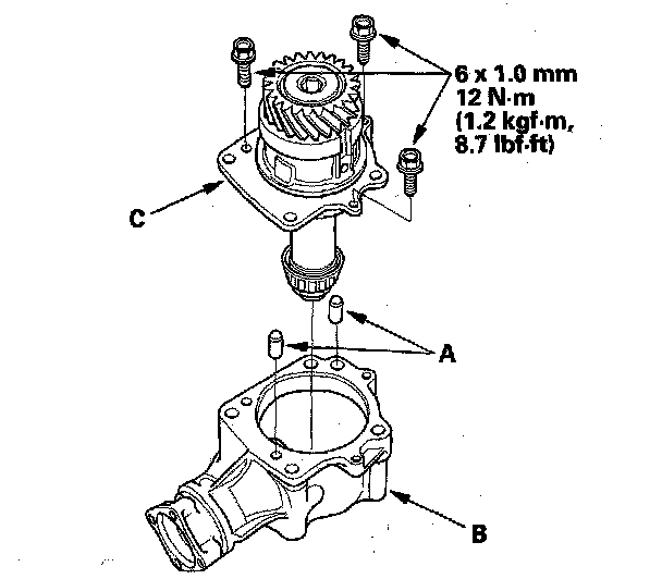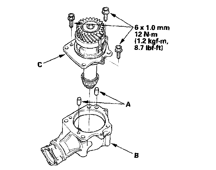 27. Install the dowel pins (A) in the transfer housing (B), then install the transfer holder assembly (C).
