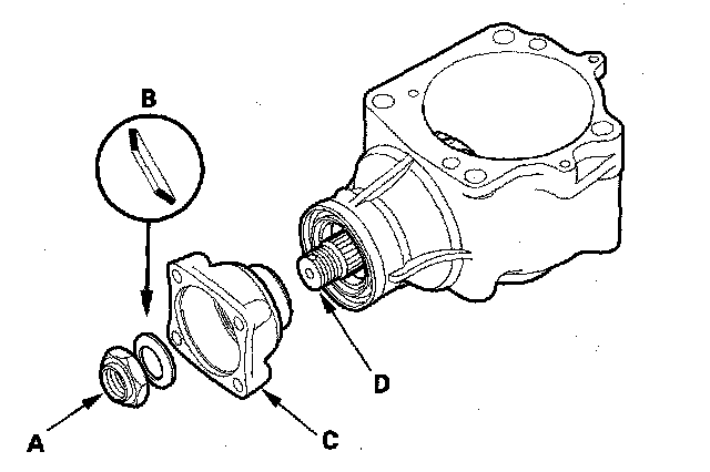 6. Install the companion flange (A), the conical spring washer (B), and the locknut (C) on the transfer output shaft (D). Do not install the O-ring and the back-up ring on the transfer gear shaft in this step.