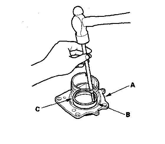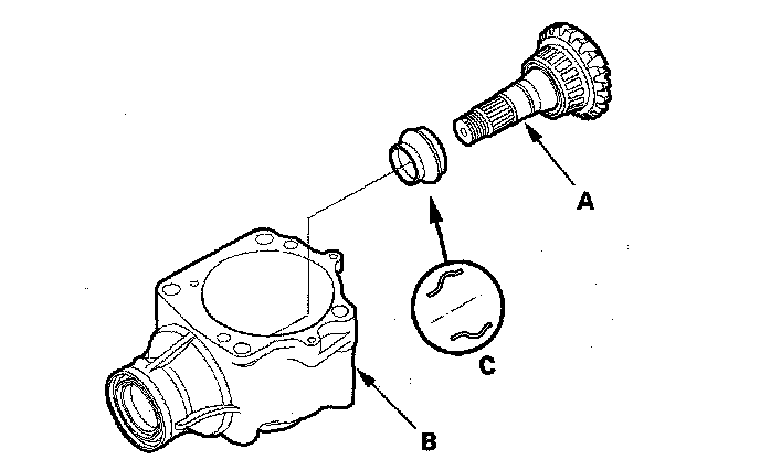 22. Install the new transfer spacer (C) on the transfer output shaft (A), then install them in the transfer housing (B).