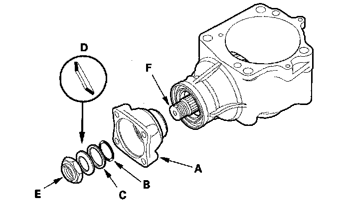 23. Install the companion flange (A), the O-ring (B), the back-up ring (C), the conical spring washer (D), and the locknut (E) on the transfer output shaft (F).