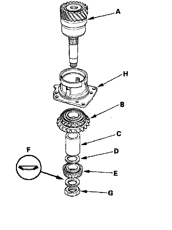 9. Install the transfer shaft assembly (A) in the transfer holder (B), then install the transfer drive gear (C), the transfer collar (D), the 25 mm thrust shim (E), the tapered, roller bearing (F), the conical spring washer (G), and the locknut (H) on the transfer shaft assembly.