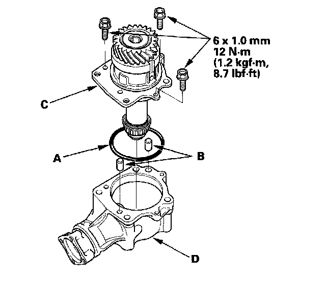 44. Coat the new O-ring (A) with MTF, install it on the transfer holder, then install the dowel pins (B) and the transfer holder assembly (C) in the transfer housing (D).