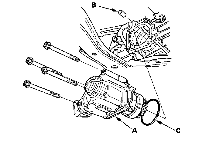 6. Remove the transfer assembly (A), the dowel pin (B), and the O-ring (C).