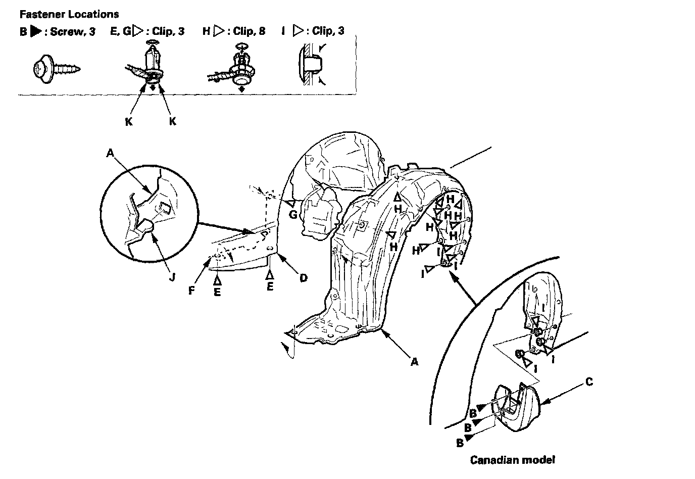 3. From the wheel arch, remove the clips (G, H, I) securing the front inner fender (and splash shield) to the body.