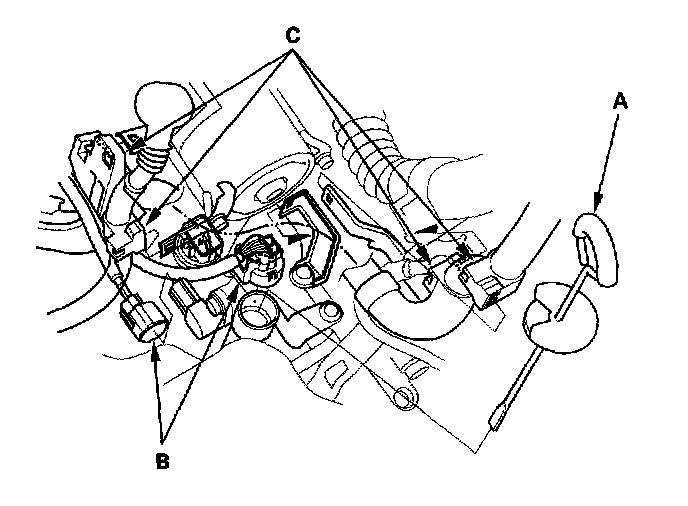 9. Remove the dipstick (A). Disconnect the connectors (B), then remove the wire harness clips (C).