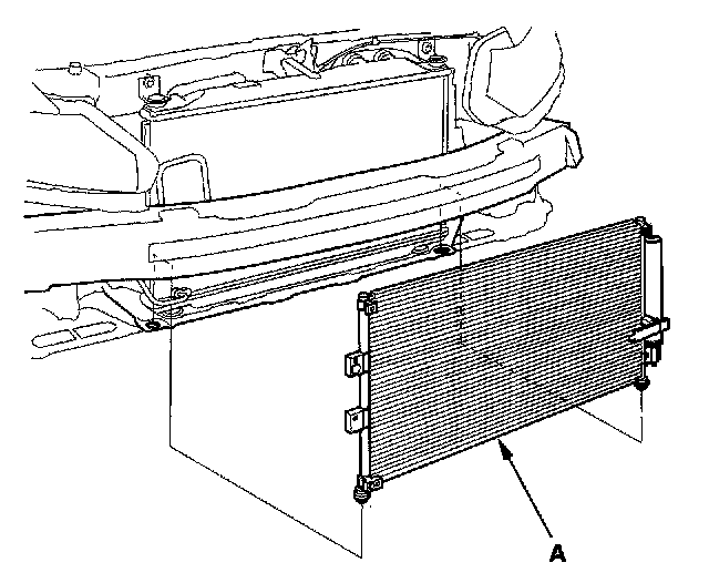 7. Remove the A/C condenser (A). Be careful not to damage the radiator and A/C condenser fins when removing the A/C condenser.