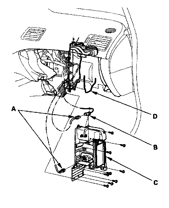 6. Disconnect the connectors (A) from the evaporator temperature sensor and the power transistor, then remove the connector clip (B). Remove the self-tapping screws, the expansion valve cover (C), and the seal (D).