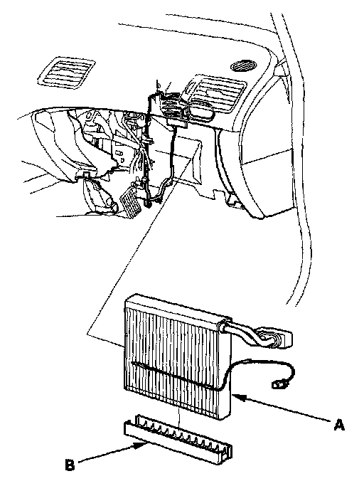 7. Carefully pull out the evaporator core (A) without bending the lines, then remove the plate (B).