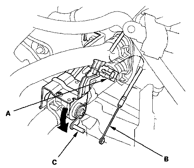 5. From under the hood, open the cable clamp (A), then disconnect the heater valve cable (B) from the heater valve arm (C). Turn the heater valve arm to the fully opened position as shown.