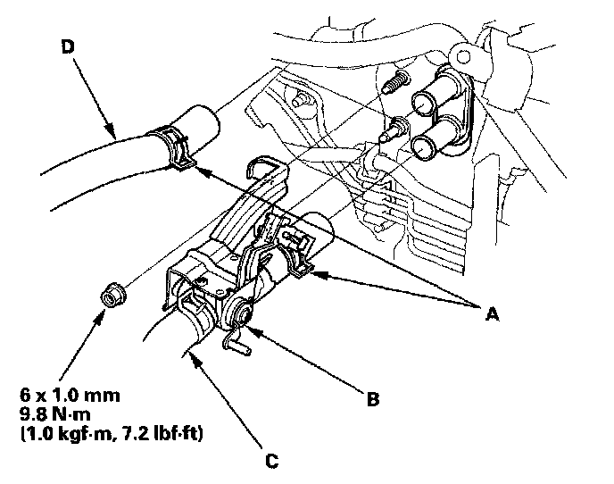 7. Slide the hose clamps (A) back. Remove the nut and the water valve (B), then disconnect the inlet heater hose (C) and the outlet heater hose (D) from the heater unit. Engine coolant will run out when the hoses are disconnected; drain it into a clean drip pan. Be sure not to let coolant spill on the electrical parts or the painted surfaces. If any coolant spills, rinse it off immediately.