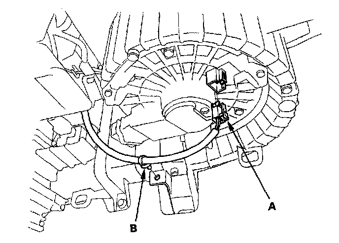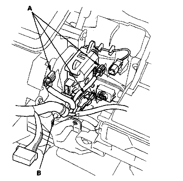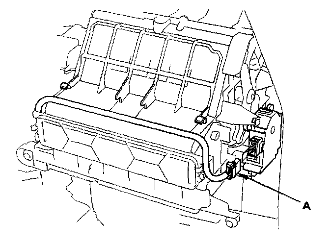 12. Disconnect the connectors (A) from the mode control motor, the evaporator temperature sensor, and the power transistor. Remove the wire harness clip (B).