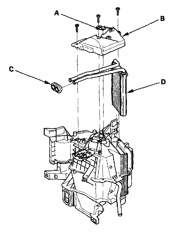 15. Remove the connector clip (A), the self-tapping screws, the heater core cover (B), the grommet (C), and carefully pull out the heater core (D).