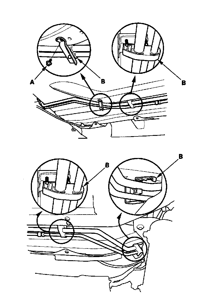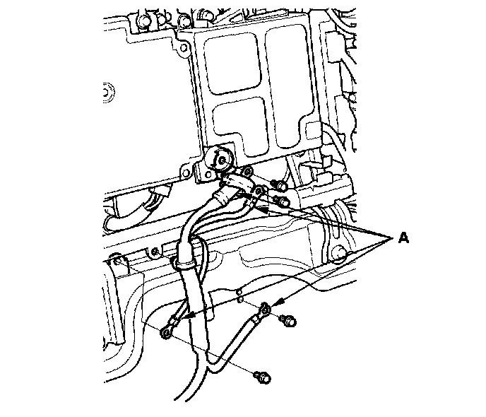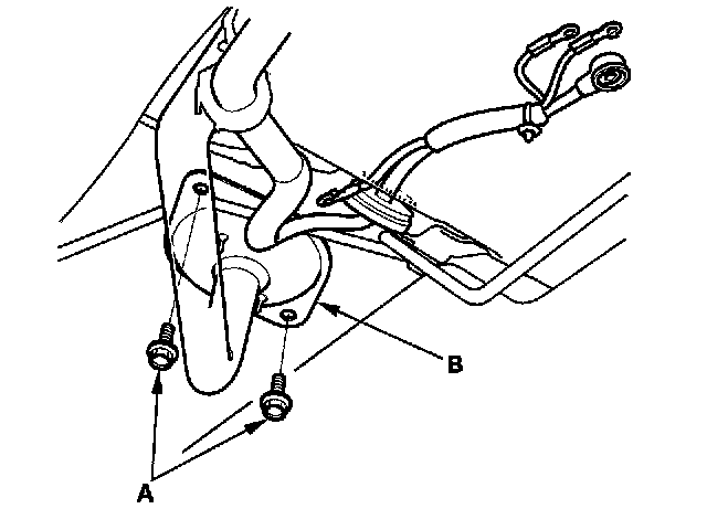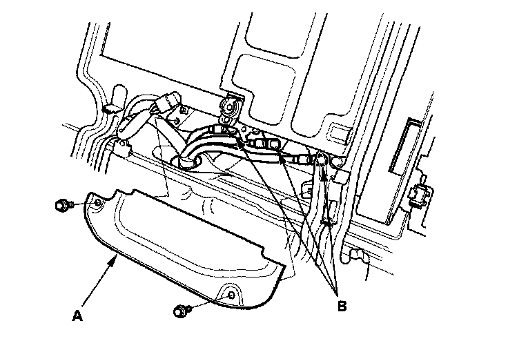 12. Remove the wire (A) from the under-hood fuse/relay box and the bolts (B).