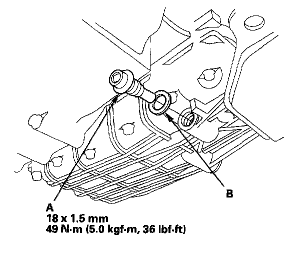 2. Remove the drain plug (A), and drain the CVT fluid (CVTF). Reinstall the drain plug with a new sealing washer (B).