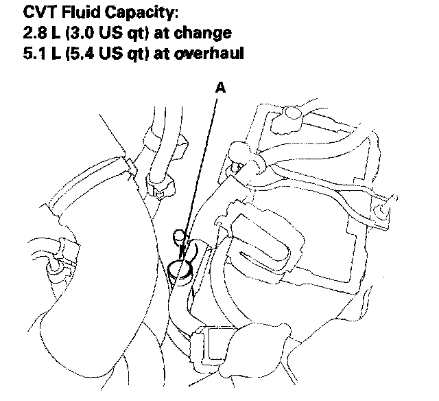 3. Refill the transmission with the recommended fluid through the dipstick tube opening (A) to bring it to the upper mark on the dipstick. Always use Honda CVT fluid (CVTF). Using a non-Honda CVTF can affect shift quality.