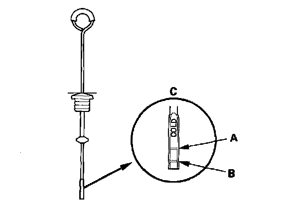 4. Check that the fluid level is between the upper mark (A) and lower mark (B) on the COLD level (C).