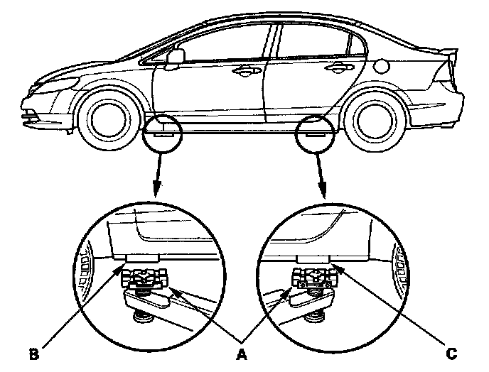 1. Position the hoist lift blocks (A) under the vehicle's front support points (B) and rear support points (C).