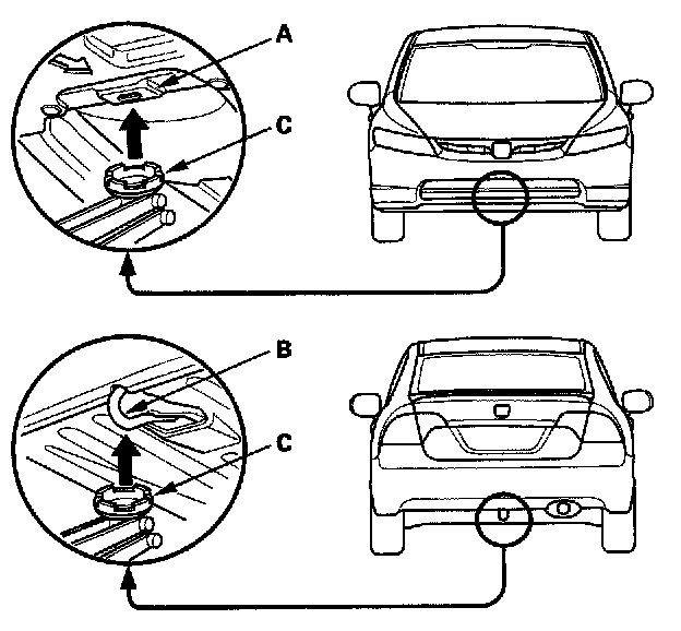 3. Position the floor jack under the front jacking bracket (A) or rear jacking bracket (B), center the jacking bracket in the jack lift platform (C), and jack up the vehicle high enough to fit the safety stands under it.