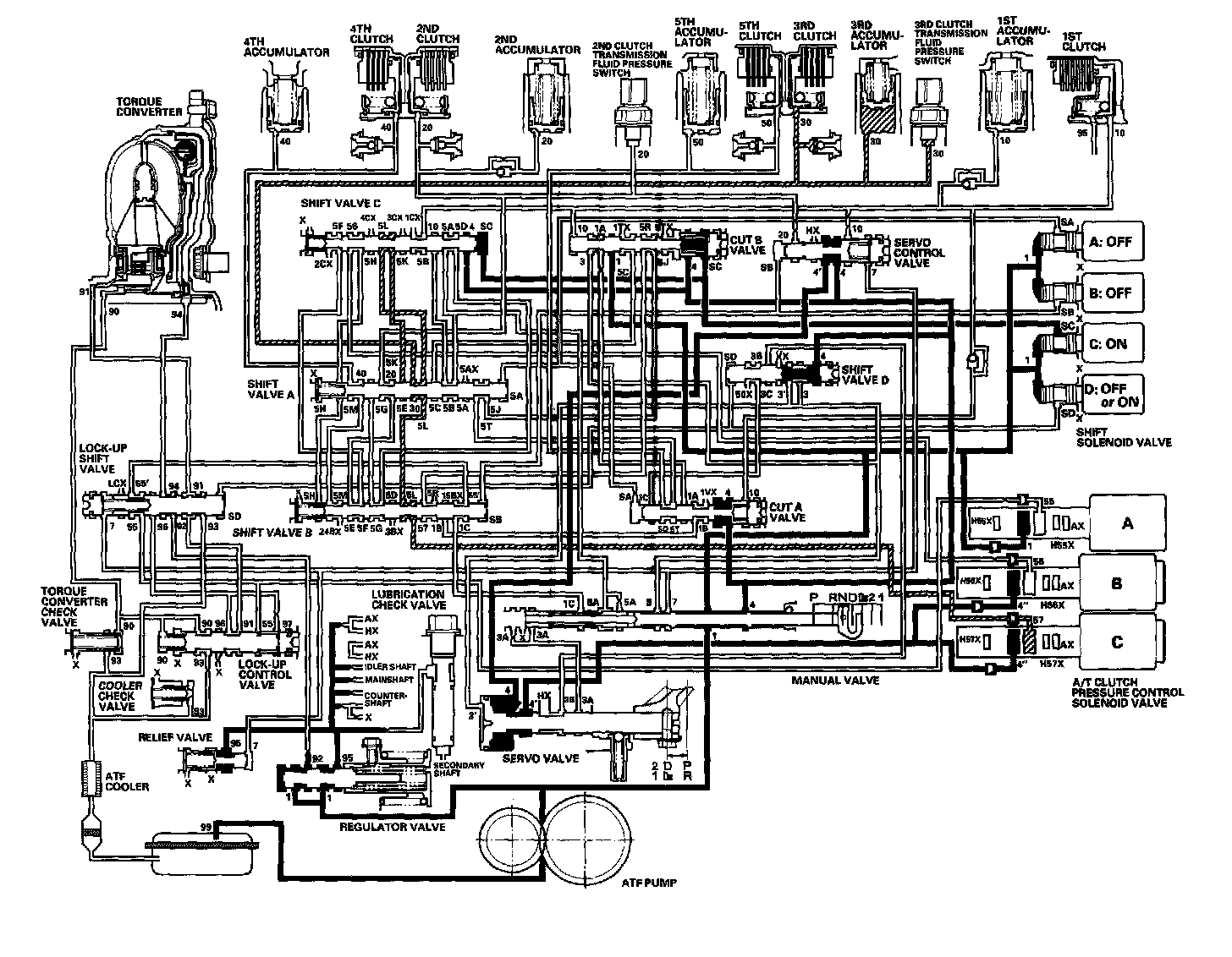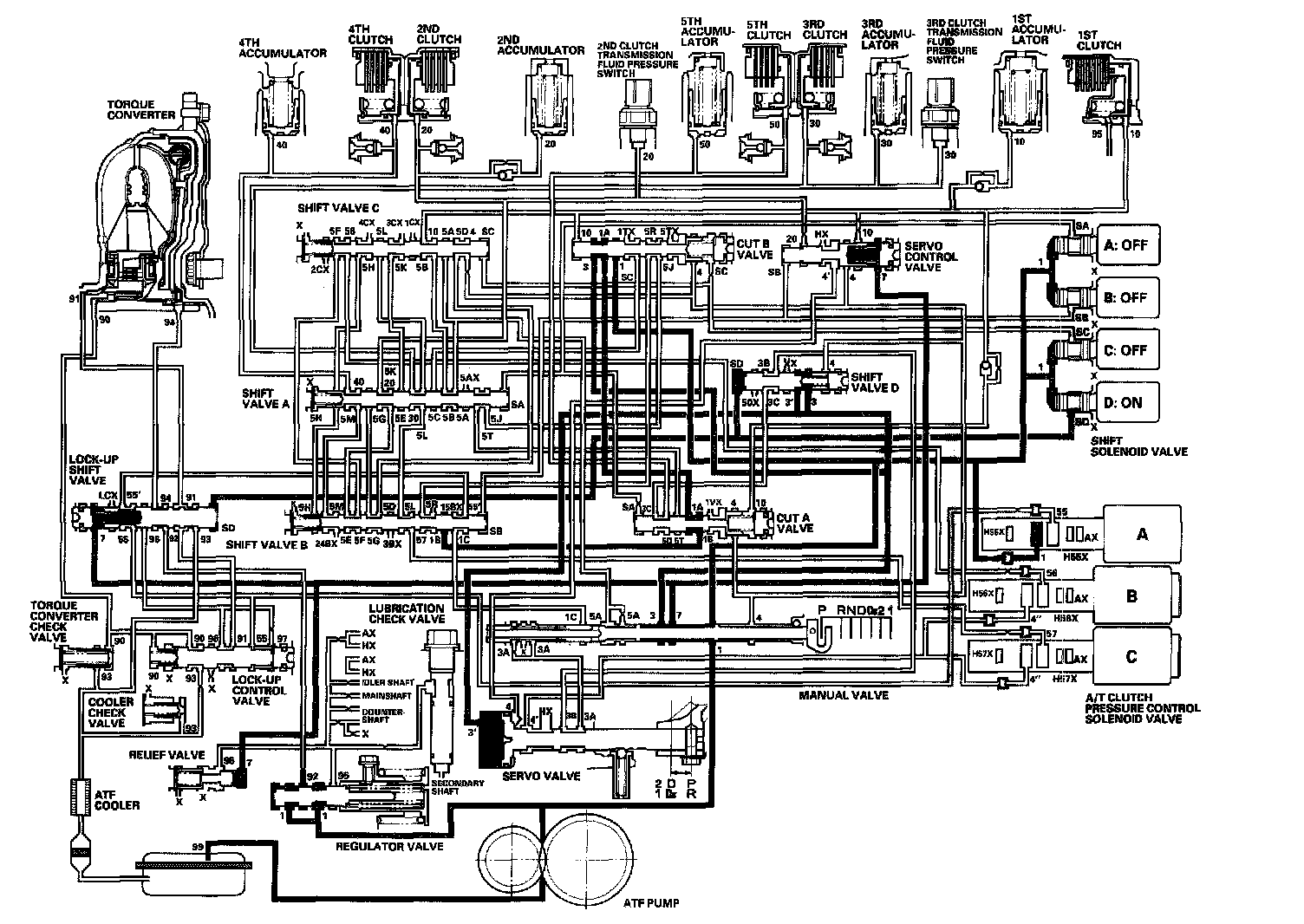 The manual valve is moved into the R position, line pressure (1) becomes line pressure (1), (3), and (7) at the manual valve. The PCM turns shift solenoid valve D ON, and shift solenoid valves A, B, and C OFF. Shift solenoid valve D pressure (SD) is applied to the left end of shift valve D, and shift valve D is moved to the right side to uncover line pressure (3) port leading to the servo valve. Line pressure (3') from shift valve D flows to the servo valve, and pushes the servo valve to the reverse position. The PCM controls A/T clutch pressure control solenoid valve A to regulate A/T clutch pressure control solenoid valve A pressure (55), and A/T clutch pressure control solenoid valve A pressure (55) flows to lock-up shift valve, shift valve B, manual valve, servo valve, shift valve D, and cut A valve. A/T clutch pressure control solenoid valve A pressure (3C) becomes 5th clutch pressure (50) at the cut A valve. 5th clutch pressure (50) is applied to the 5th clutch, and the 5th clutch is engaged with the A/T clutch pressure control solenoid valve A pressure mode.