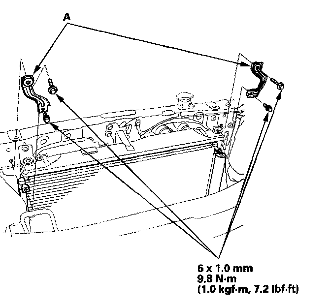 5. Remove the bolts and the A/C condenser upper mount brackets (A).