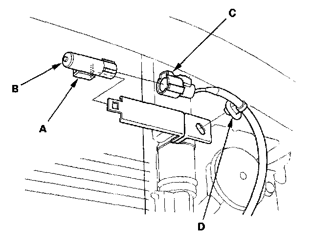 6. Lift the tab (A) to release the lock, then remove the outside air temperature sensor (B) from the receiver/dryer desiccant bracket. Disconnect the 2P connector (C) then remove the clip (D).