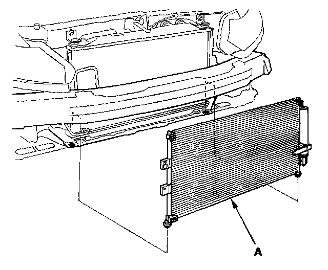 7. Remove the A/C condenser (A). Be careful not to damage the radiator and A/C condenser fins when removing the A/C condenser.