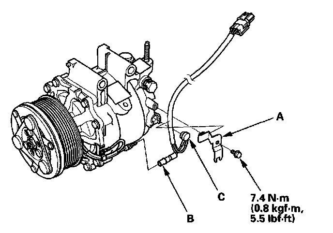 A/C Compressor Thermal Protector Replacement1. Remove the bolt and the holder (A). Disconnect the field coil connector (B), then remove the thermal protector (C).
