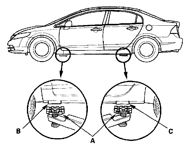 1. Position the hoist lift blocks (A), on safety stands, under the vehicle's front support points (B) and rear support points (C).