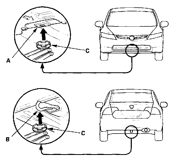 3. Position the floor jack under the front jacking bracket (A) or rear jacking bracket (B). Center the jacking bracket in the jack lift platform (C), and jack up the vehicle high enough to fit the safety stands under it.