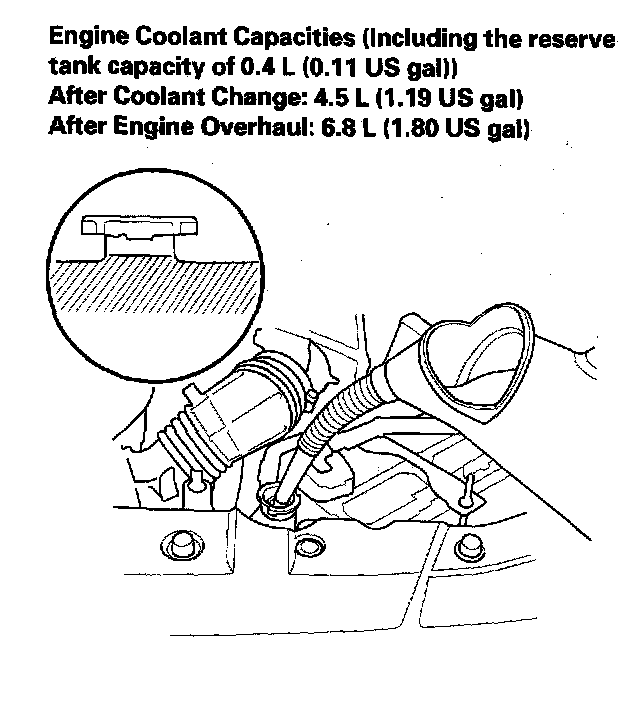 7. Pour Honda Long Life Antifreeze/Coolant Type 2 (P/N OL999-9001) into the radiator up to the base of the filler neck.