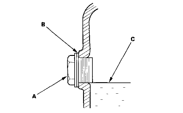 2. Remove the oil filler plug (A) and washer (B), check the condition of the fluid, and make sure it is at the proper level (C).