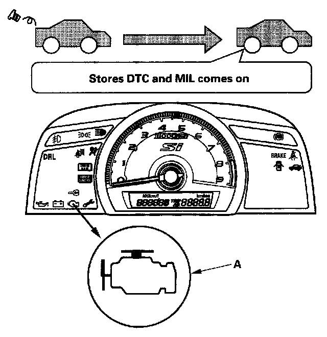 During the third drive cycle after a cold start, if the fuel fill cap is still loose or missing, the ECM stores DTC P0457 "Evaporative Emission (EVAP) System Leak Detected/Fuel Fill Cap Loose or Missing". The malfunction indicator lamp (MIL) (A) comes on, and the "CHECK FUEL CAP" message goes off.