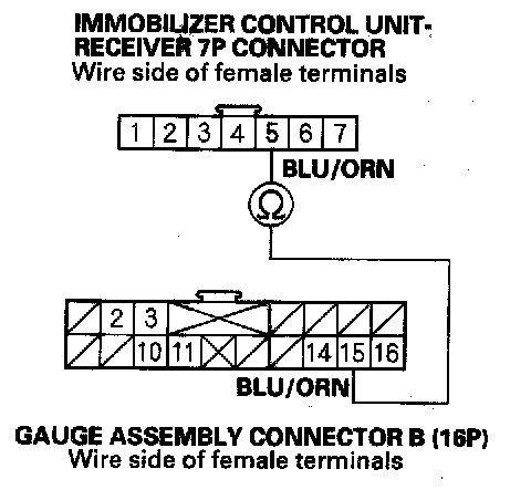17. Check for continuity between the immobilizer control unit-receiver 7P connector No. 5 (IMOARM) terminal and gauge assembly 16P connector No. 15 terminal.